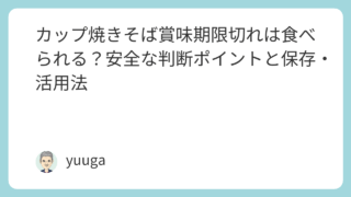 知った カップ焼きそば賞味期限切れは食べられる?安全な判断ポイントと保存・活用法 カップ焼きそばの賞味期限切れは、未開封で保存状態が良ければ1〜2ヶ月程度なら食べられる可能性があります。ただし、麺の変色や酸化臭、ソースの分離や異臭など、少しでも異常を感じたら安全のために処分するのが正しい判断です。この記事では、カップ焼き... 知った